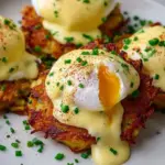 This Latke Eggs Benedict stands out with its irresistible combination of flavors and comforting textures. The crispy, golden latkes replace the traditional English muffin, bringing a hearty potato element that complements the delicate poached eggs perfectly. The hollandaise, creamy and zesty, adds a luxurious richness, while fresh chives introduce a fragrant note that brightens up each bite.